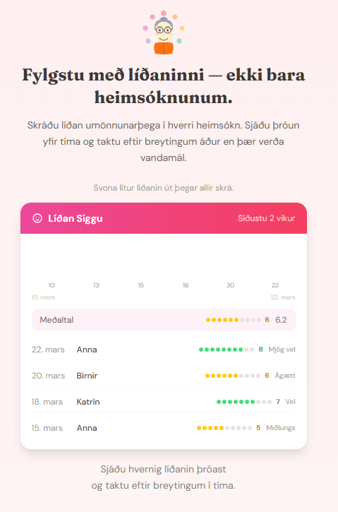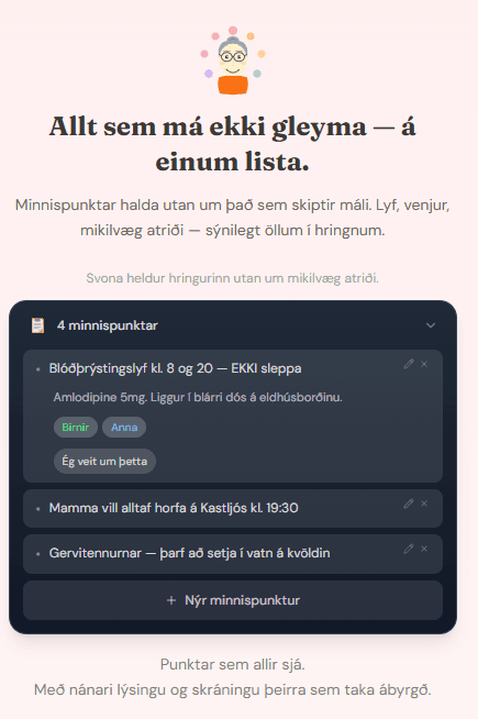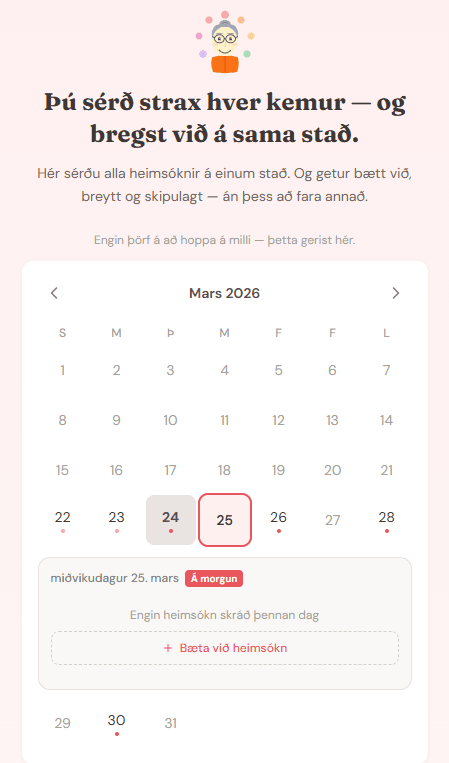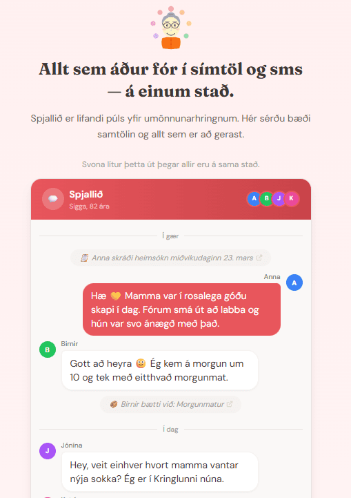 Umönnunarkerfi eru til í þúsundatali. En það að umonnun.is skyldi hafa verið laust lén, og að nánast ekkert venjulegt fólk hafi heyrt um þær lausnir sem þegar eru til á þessu sviði, segir sitt. Þetta þarf að nálgast frá öðru sjónarhorni, frá sjónarhorni fólksins sem er í raun og veru að reyna að halda utan um umönnunina, vera til staðar og láta hlutina ganga upp. Hver kemur hvenær. Hvað hefur verið gert. Hverju gleymdist að segja frá. Hlutirnir sem detta á milli, ekki vegna þess að engum sé ekki sama, heldur vegna þess að það vantar góða leið til að vera samstíga.